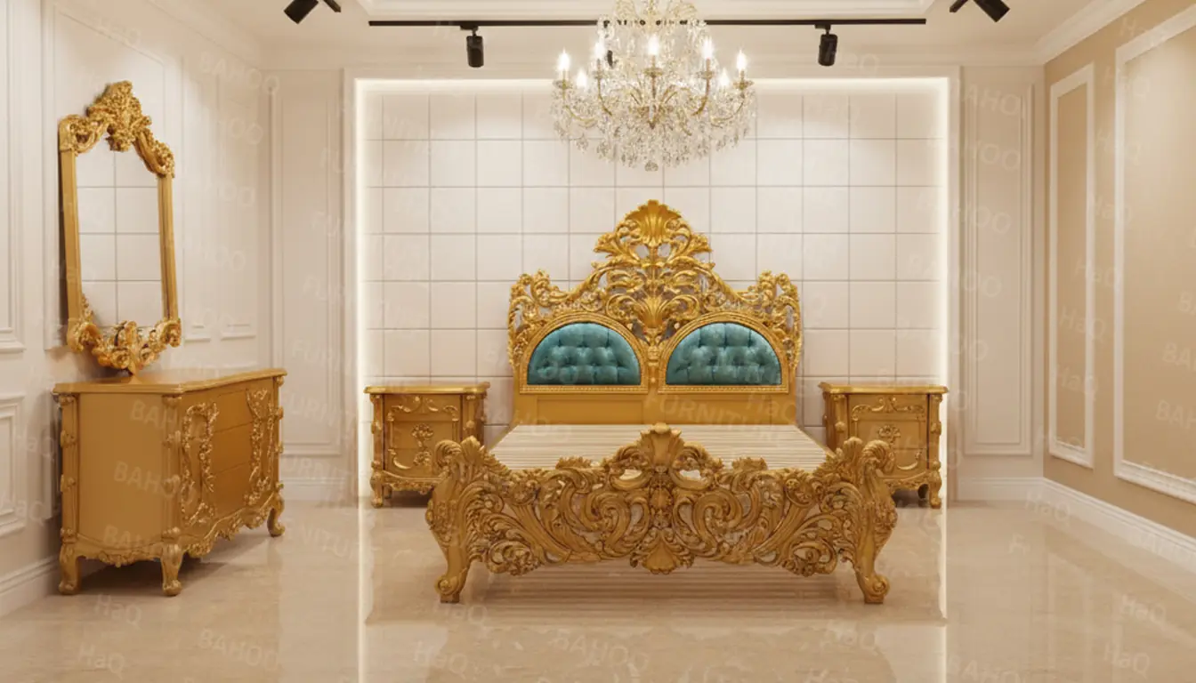 Bedroom set with two side tables and dressing in golden paint.