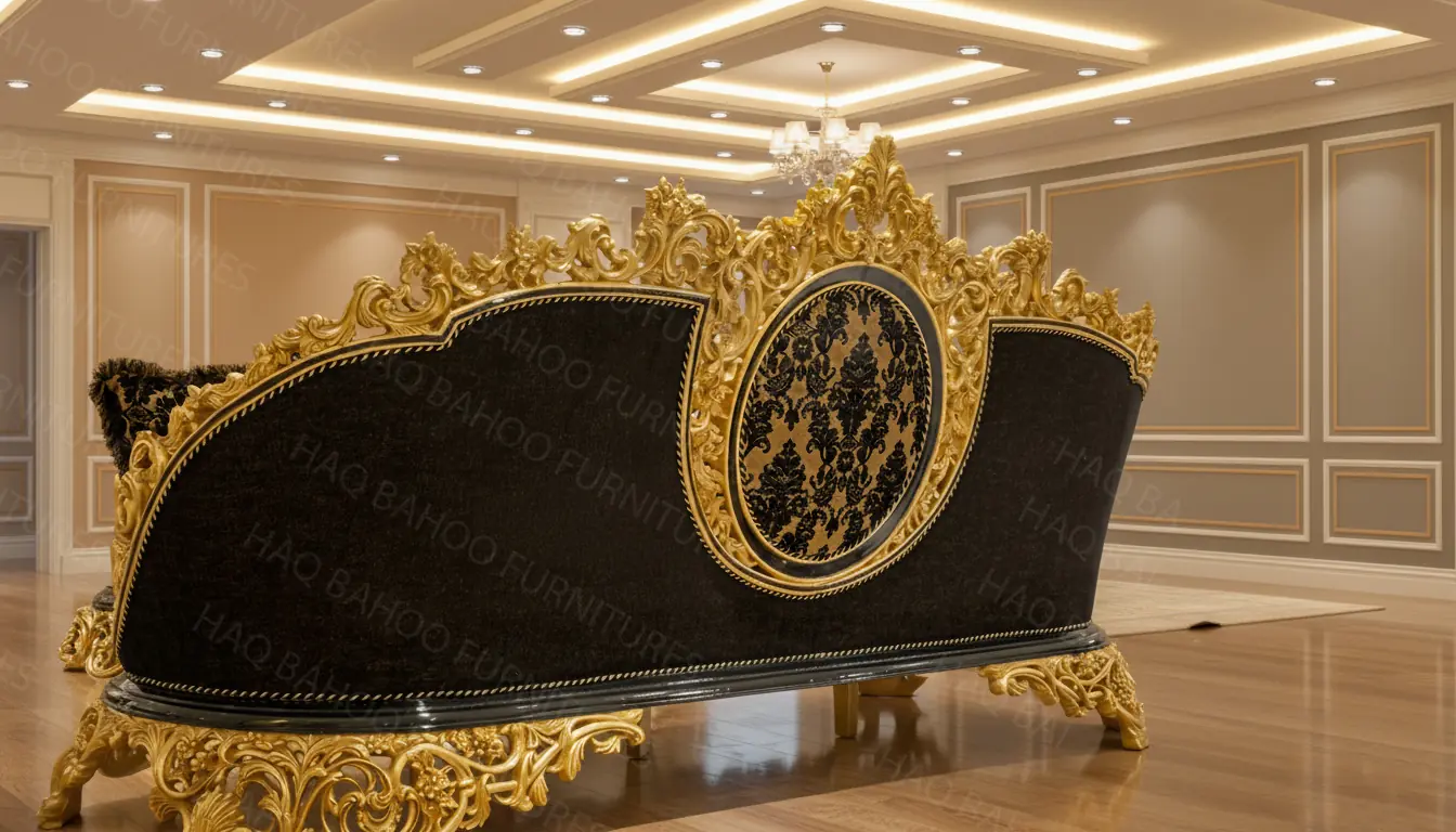 All wooden components are hand-carved by skilled Chiniot craftsmen and finished in a rich golden tone. The fabric used across the sofa and bed is premium black, chosen for comfort, durability, and luxury appeal.