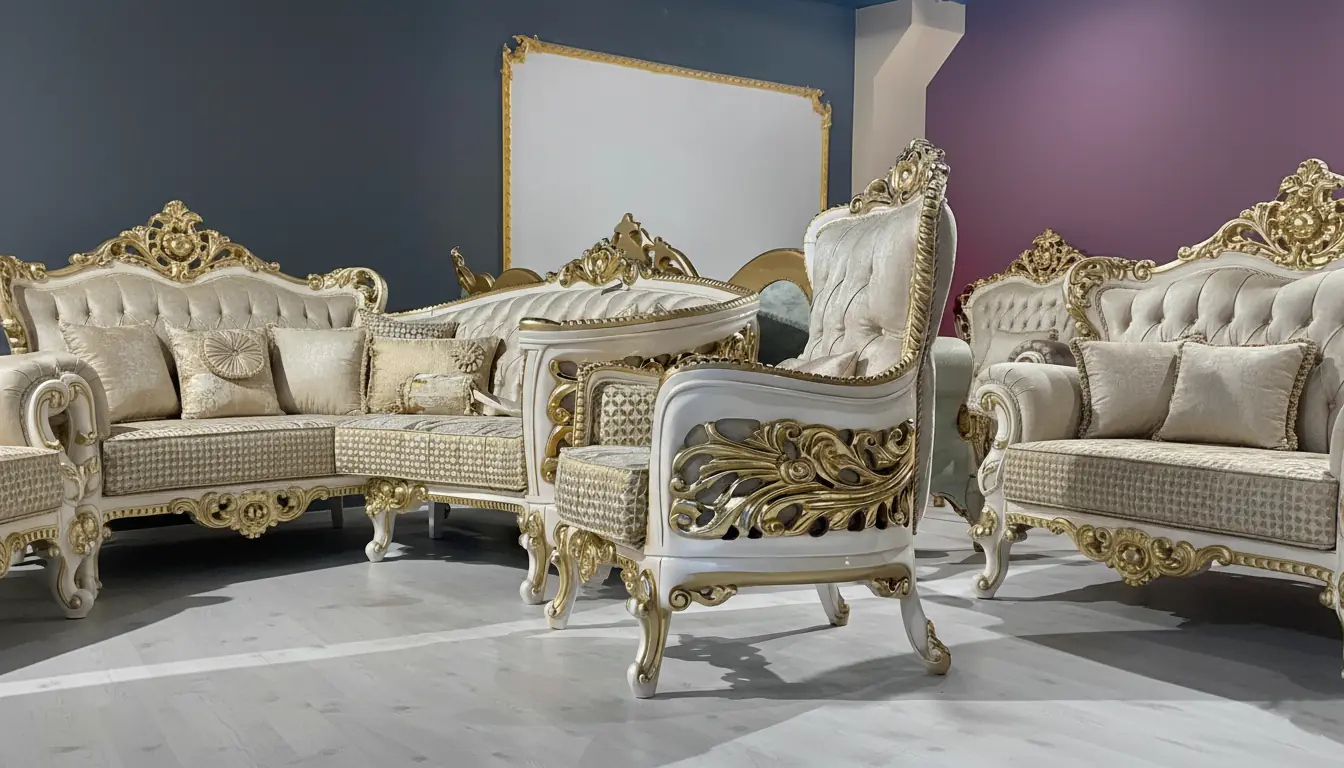 7 Seater Sofa Set – White & Gold Finish | Custom Made in Rosewood