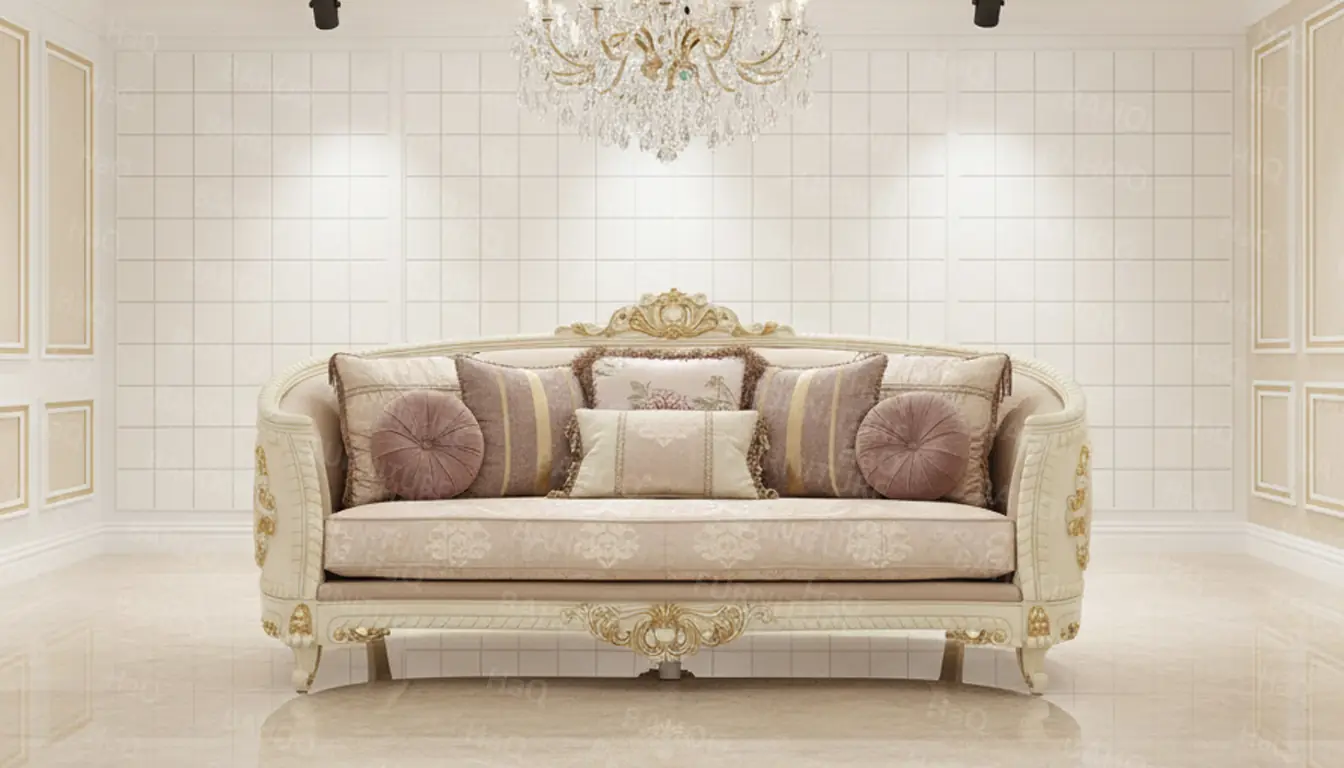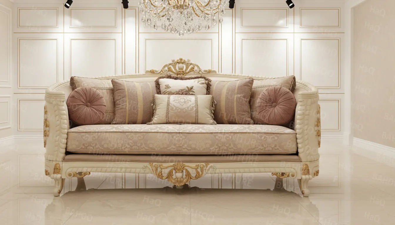 7 Seater Sofa Set – White & Gold Finish | Custom Made in Rosewood