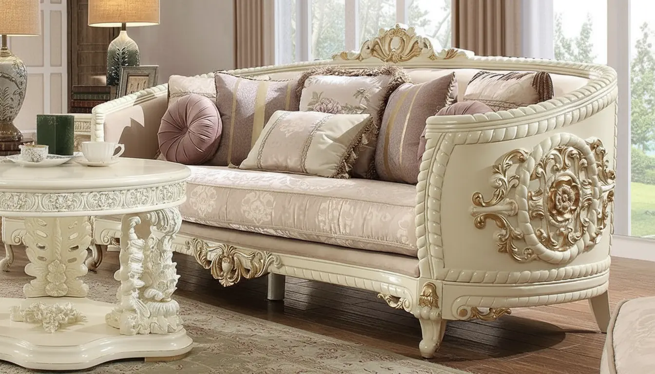 Handmade 7 Seater Sofa Set – Rosewood in White Paint with Golden Carving